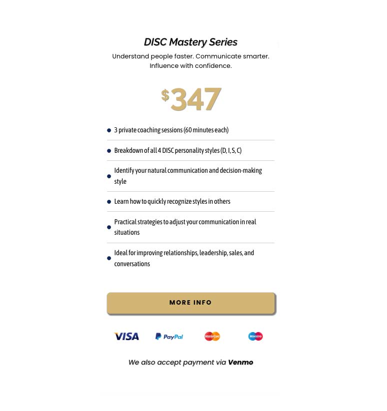 Across the three sessions, we’ll explore the four DISC styles and how they influence communication, leadership, sales, conflict resolution, and everyday interactions. You’ll also learn how to quickly identify personality tendencies and adjust your approach in real time.