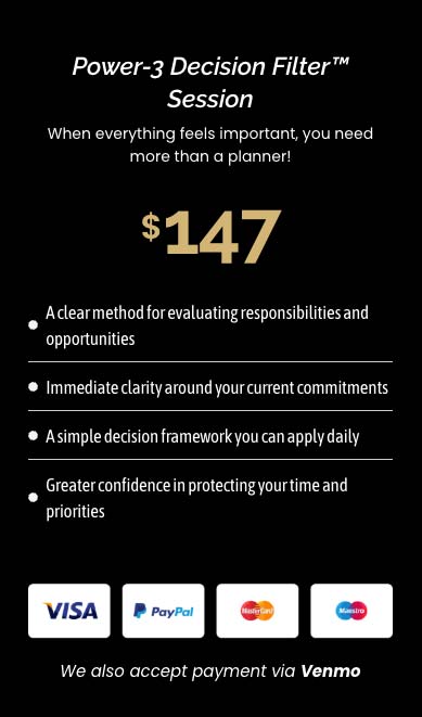 In this focused 90-minute session, you’ll learn Brittany Hartman’s Power-3 Decision Filter™, a simple but powerful framework designed to help you quickly evaluate responsibilities, commitments, and opportunities so you can focus on what truly moves your life and goals forward.