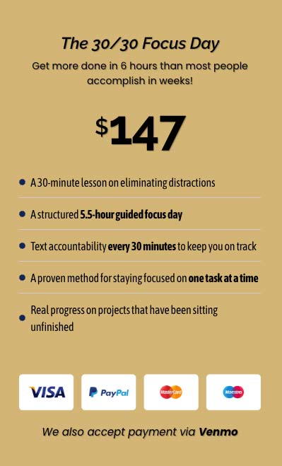 Your day begins with a 30-minute coaching session where you’ll learn practical strategies for eliminating distractions, organizing your focus blocks, and committing to one priority task at a time.
